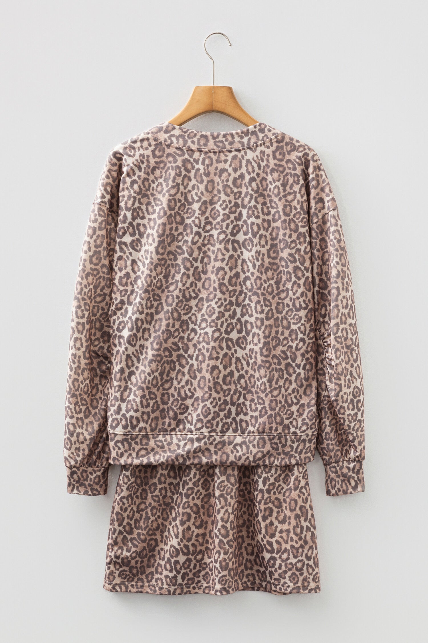 Make a bold statement with our Light French Beige Leopard Print Set. This eye-catching duo features a relaxed, drop-shoulder V-neck pullover paired perfectly with a matching mini skirt. Designed with a wide waistband for a flattering silhouette and functional pockets for everyday ease.