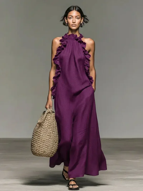 Capture the essence of summer elegance with this Burgundy Linen-Blend Ruffled Maxi Dress. This piece combines a minimalist, airy silhouette with romantic textures, making it a standout choice for both resort wear and special seasonal events.